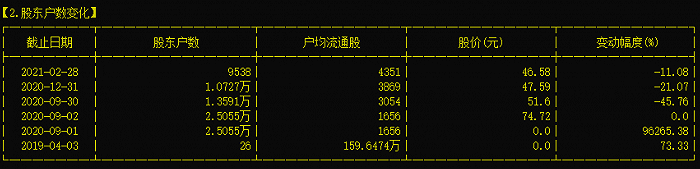 股东户数方面,截至2月28日最新数据显示,苑东生物有9538户股东,户均流通股4351股,而在2020年12月31日时的股东户数为1.07万户,户均流通股3869股,筹码有一定程度集中。