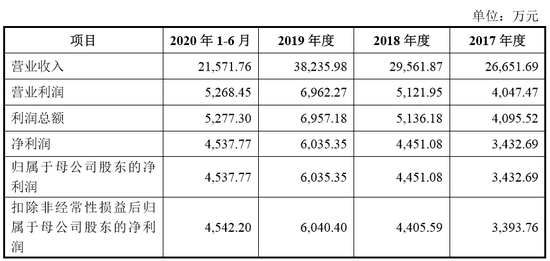 2017年、2018年、2019年及2020年上半年,公司营业收入分别为2.67亿元、2.96亿元、3.82亿元及2.16亿元,扣非归母净利润分别为0.34亿元、0.44亿元、0.60亿元及0.45亿元。