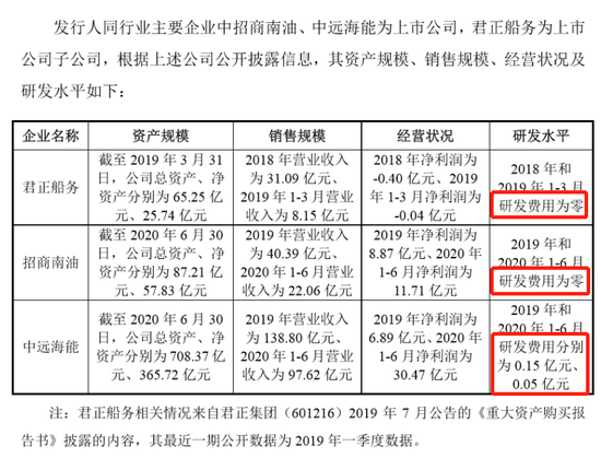 公司招股书特别比较了上述8家公司中的招商南油(2.300, -0.01,-0.43%)、中远海能(6.470, -0.11, -1.67%)、君正船务。其中君正船务、2018年和2019年1-3月研发费用为零,招商南油2019年和2020年上半年研发费用为零,中远海能2019年和2020年上半年研发费用分别为1500万元、500万元。而中远海能2019年净利润6.89亿元、2020年上半年净利润30.47亿元,净利润是南京盛航海运10多倍。