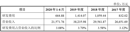2017年、2018年、2019年及2020年上半年,公司研发费用分别为832万元、1059万元、1414万元及665万元,占同期营业收入的比例分别为3.12%、3.58%、3.70%及3.08%。