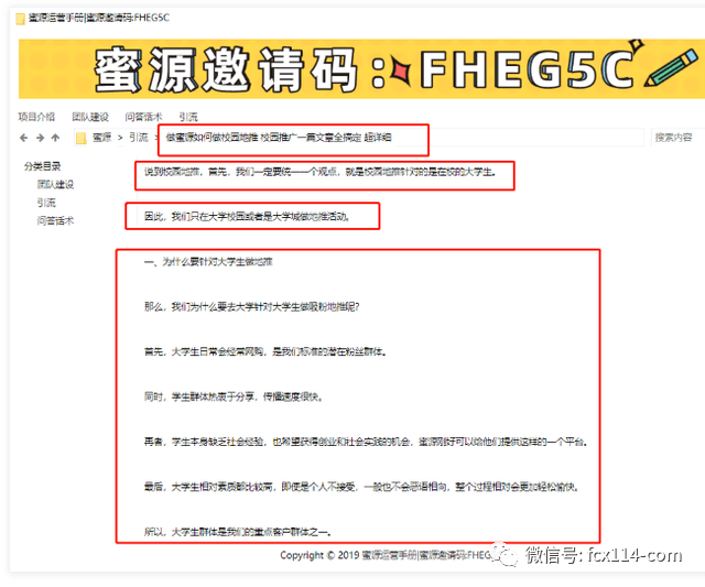 中国网财经记者在网上检索到一篇名为《做蜜源如何做校园地推 校园推广一篇文章全搞定、超详细》的文章,该文章称,“校园地推针对的是在校大学生,因此,只在大学校园或者是大学城做地推活动”。