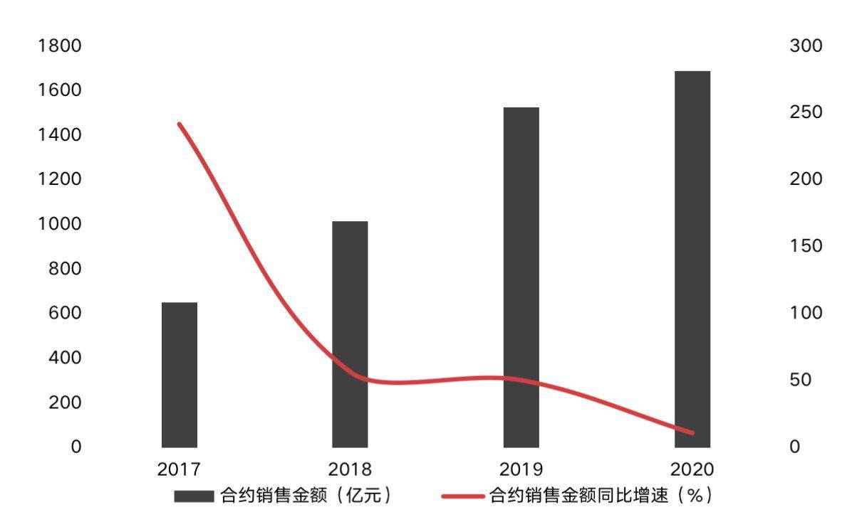《投资时报》研究员查阅相关数据留意到,从合约销售金额复合增长率指标来看,该公司已经由2016年的190亿元大幅上涨至2020年的1688亿元,年复合增长率高达72.65%。然而2017年至2020年,其各年度合约销售金额同比增速分别为241.58%、56.39%、50.25%及10.69%。