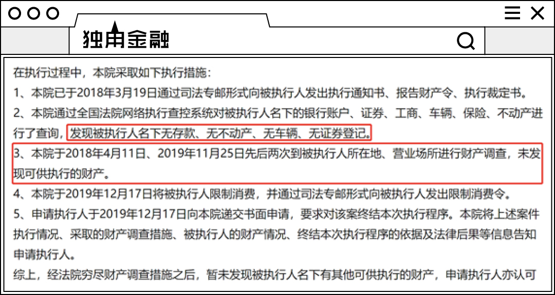 2018年4月11日、2019年11月25日,法院又先后两次到被执行人所在地、营业场所进行财产调查,未发现可供执行的财产。
