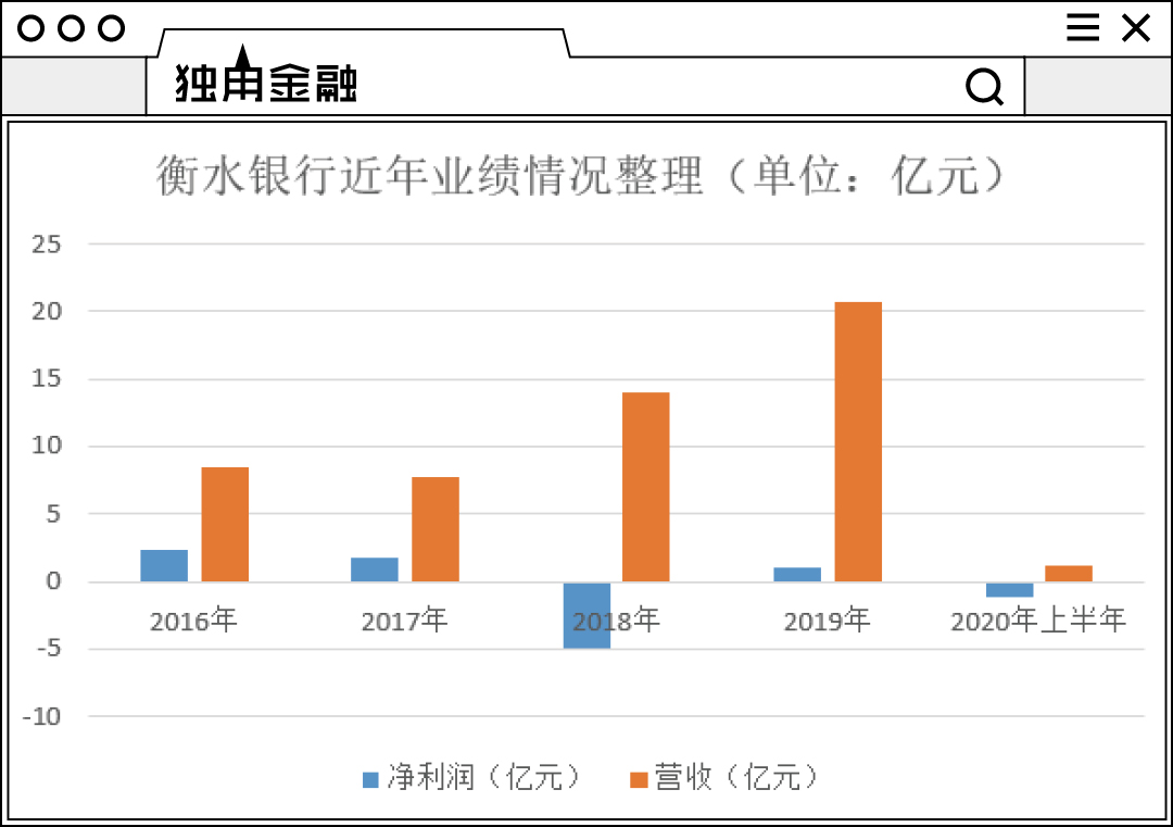 近年衡水银行的业绩起起落落。公开数据显示,2016年至2020年上半年,衡水银行营业收入分别为8.4亿元、7.75亿元、13.95亿元、20.65亿元、1.11亿元;同期净利润为2.34亿元、1.77亿元、-4.89亿元、1.08亿元、-1.12亿元。
