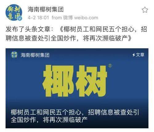 4月2日,@海南椰树集团 发布文章《椰树员工和网民五个担心,招聘信息被查处引全国炒作,将再次濒临破产》(全文附于文末),称近期椰树不是在其他媒体、仅是在自己的官微上面向全国发布高薪招聘人才的信息,用了“有车、有房、有高薪,肯定有美女帅哥追”这句话,目的是吸取营销人员长期背井离乡和待遇低难找对象导致前几次招聘人才报名少的教训提出来的。