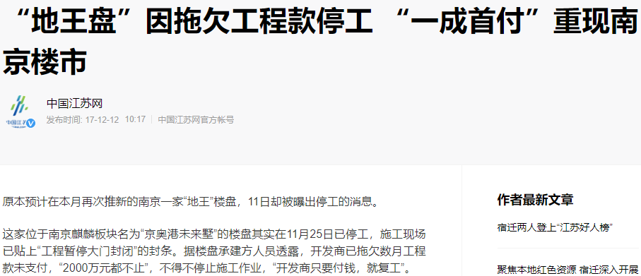 但由于销售不佳、借款到期等原因,2017年12月12日,京奥港置业传出资金断裂,地王项目停工的消息。