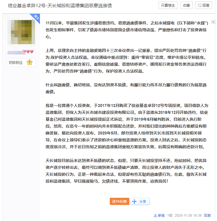 据介绍,安徽蓝德集团从2018年12月开始违约,信业基金对借款人和担保方提起诉讼,并于2019年8月胜诉,目前进入执行阶段。然而,天长城投并未积极还款,信业基金也没有什么督促还款的措施,目前天长城投试图拖延到资不抵债破产清算的地步,有逃废债的倾向。