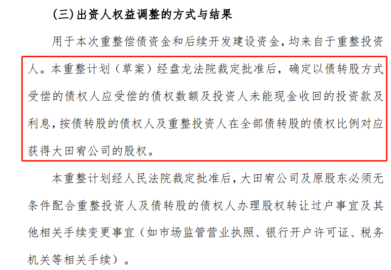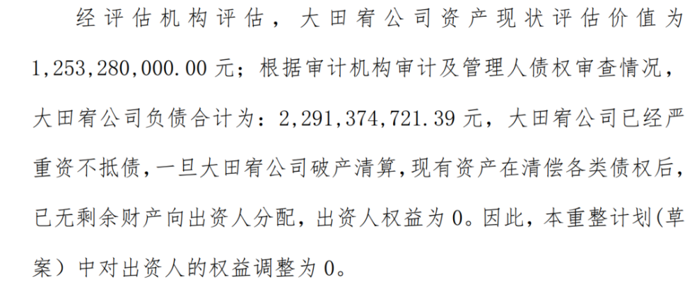《昆明大田宥房地产开发有限公司破产清算转重整案第二次债权人会议》资料显示,大田宥负债金额为22.9亿元,依据《破产法》,有财产担保的嘉兴宇弘优先受偿2.2亿元,盘龙区建设投资公司优先受偿1.6亿元。