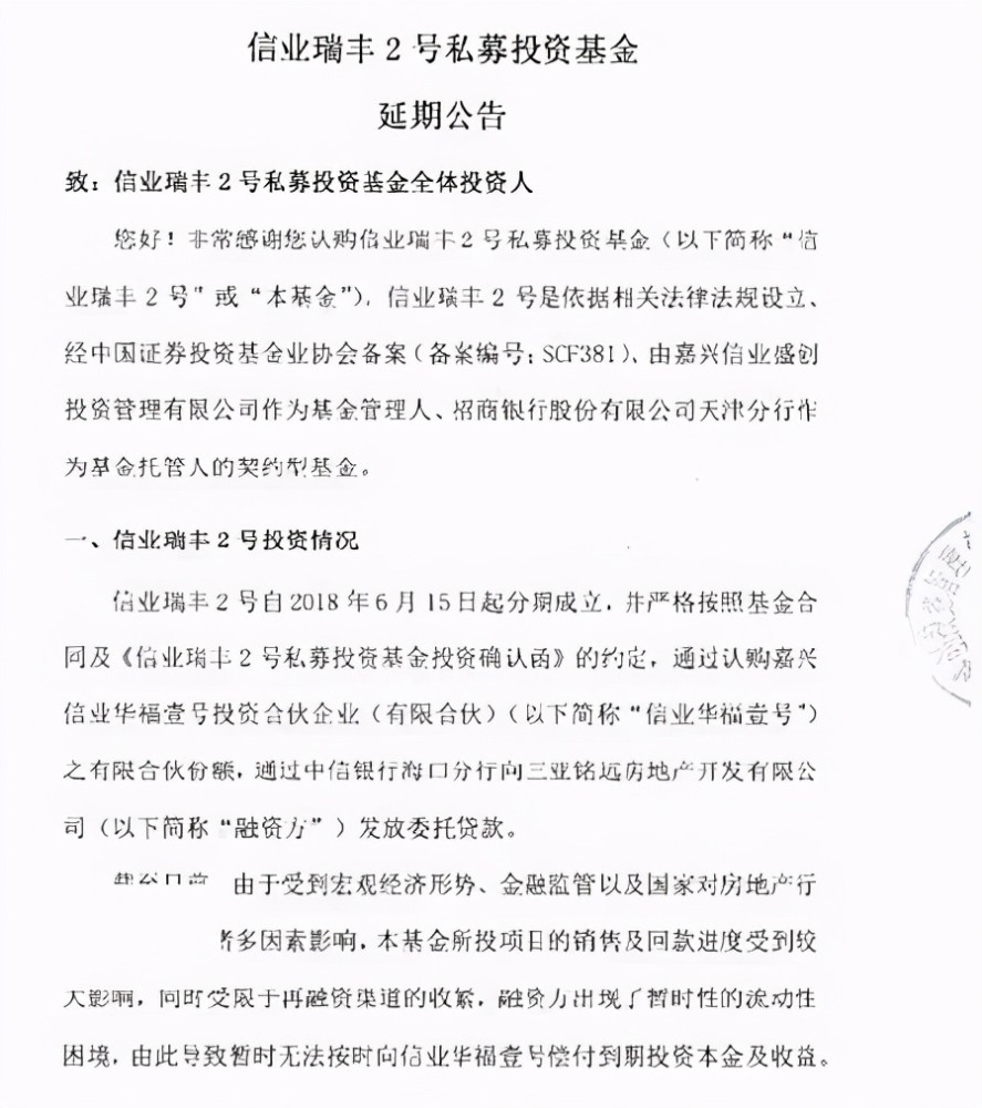 信业基金子公司发行了信业瑞丰2号,向苏绍兴旗下的三亚铭远房地产发放委托贷款,这个公司却于2019年底与苏绍兴另一家公司一起破产重整了。