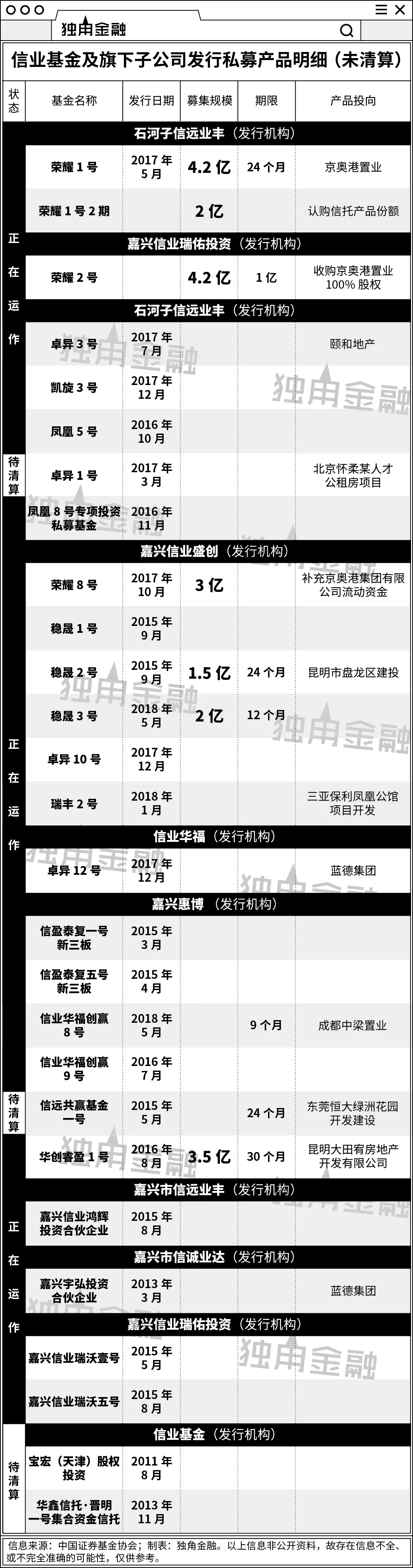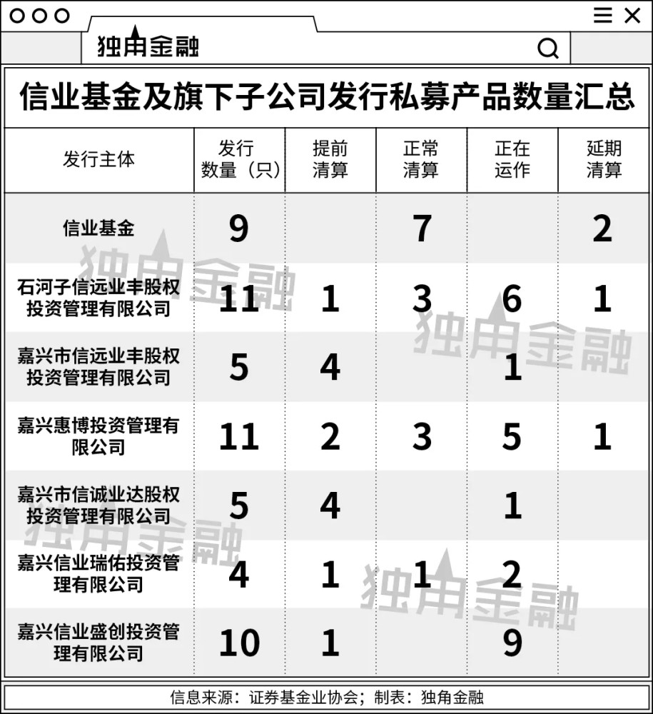 独角金融搜集到的信业基金及一级子公司目前未清算的27只私募产品。仅能查询到的募资规模已超15亿元。据投资者反映,10只以上产品违约。