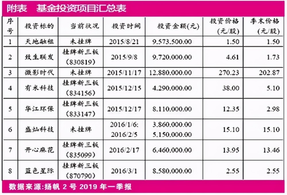 杨帆2号2020年四季度报告显示,管理基金规模9686万,开心麻花、橙天嘉禾影城实现退出,分别分配至投资者679.93万元、2923.98万元。而对于此前发生较大损失的标的,则没有提及。