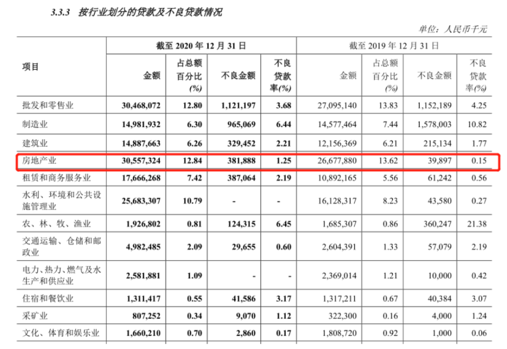 房地产业是郑州银行放贷最大的行业,占贷款总额的12.84%。2020年房地产业贷款余额3.82亿元,较上年末增加了3.42亿元,增幅高达857%;房地产业不良率为1.25%,虽然绝对值不高,但是增速很快,是2019年末的8.33倍, 2019年房地产业贷款不良率只有0.15%。