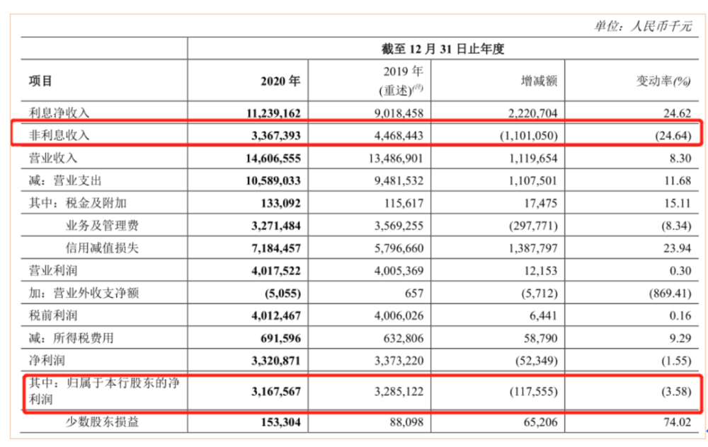 2020年,郑州银行归母净利润的下滑主要有两方面的原因,一是非利息性收入减少,二是加大了资产减值损失的计提力度。