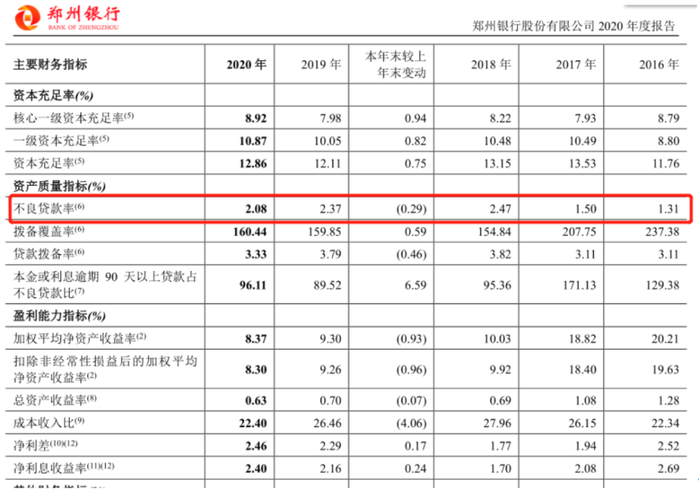 从资产质量指标来看,郑州银行2020年逾期贷款率3.04%,同比降低0.60个百分点;不良贷款率2.08%,连续三年实现下降。