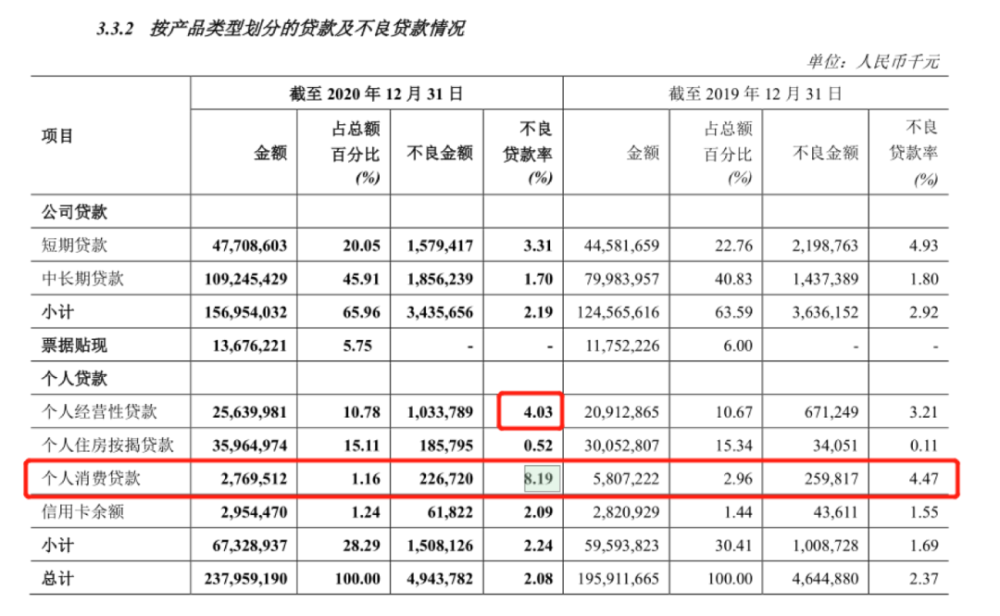 而从结构上来看,个人消费贷款不良率猛增,由4.47%增至8.19%;个人经营类贷款不良率也从3.21%增至4.03%。消费是推动经济增长的“加速器”,郑州银行不遗余力推动零售业务转型,深挖个人客群,但实际上个人消费贷款规模却出现萎缩,从2019年的58.07亿元降至27.69亿元。