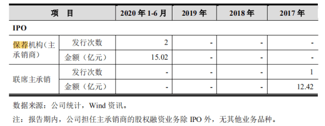 可以看出,信达证券对经纪业务的依赖程度不断降低。同时,2017年至2019年,信达证券作为主承销商的IPO项目数量连续三年颗粒无收,2020年仅完成2单IPO项目。