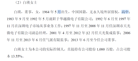 资料显示,白瑛,1964年5月出生,中国国籍,高中学历,1983年9月至1992年5月就职于华越微电子有限公司;1997年11月至2008年11月任深圳市天光微电子有限公司副总经理,2001年4月至2012年12月任天光集成监事;2006年11月至2013年6月任气派有限监事;2013年6月至今任公司董事。