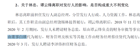 2018年11月,气派科技财务总监谭云烽离职。谭云烽离职后,2018年11月至2020年2月期间,气派科技未聘请财务总监,原由谭云烽负责的财务审批等事宜由董事白瑛代为履行。