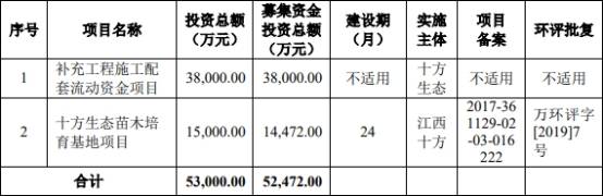 十方生态原拟在上交所主板上市,拟发行不超过3228.2043万股,占发行后总股数的比例不低于25%。十方生态原拟募集资金5.25亿元,其中,3.80亿元用于补充工程施工配套流动资金项目,1.45亿元用于十方生态苗木培育基地项目。