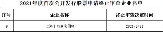 中国经济网北京4月6日讯 据中国证监会官网4月2日消息,中国证监会决定对上海十方生态园林股份有限公司(以下简称“十方生态”)首次公开发行股票申请终止审查。