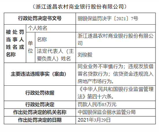 丽银保监罚决字〔2021〕7号显示,浙江遂昌农商行三项违规:同业业务不审慎行为;违规发放借冒名贷款行为;信贷资金违规流入房地产市场行为。