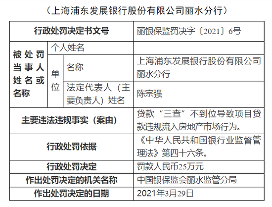 浦发银行丽水分行被罚25万:项目贷款违规流入房地产