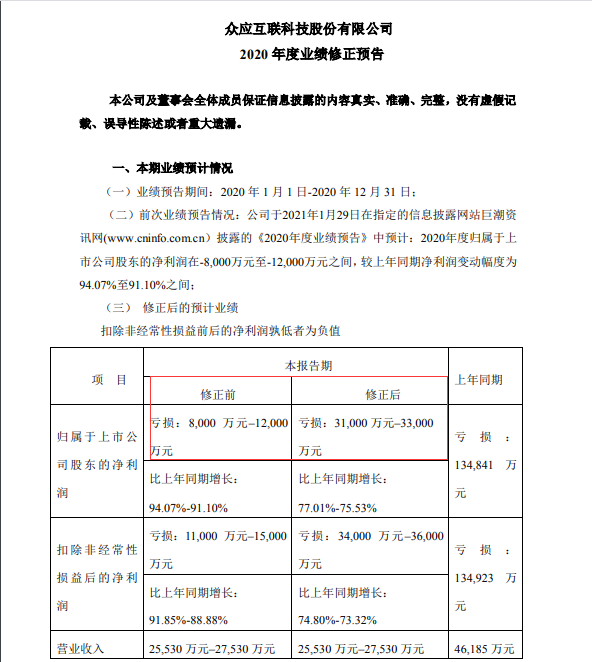 众应互联修正业绩预告:去年亏损超3亿 5万股东被“埋”