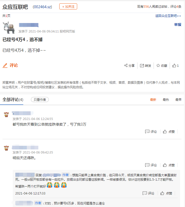 有网友回复该帖子称,4月5日晚间看到公告就挂跌停卖,亏了3万。而有网友告知,想跑只能早上集合竞价跑,但只限今天,明后天集合竞价都是大单直接封死。