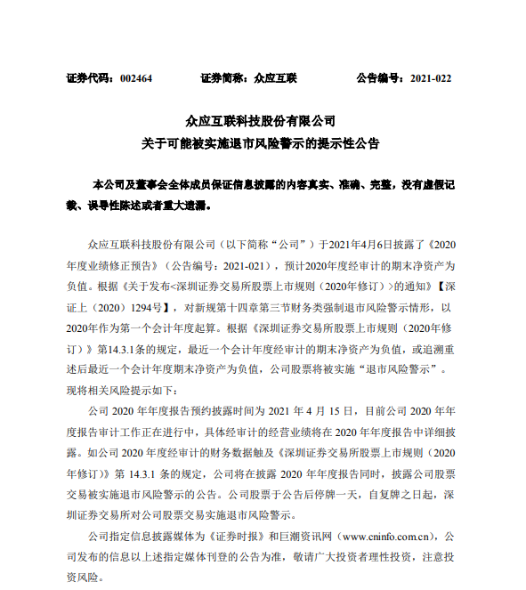 除了业绩大幅下修之外,众应互联还发布了关于可能被实施退市风险警示的提示性公告,根据《关于发布<深圳证券交易所股票上市规则(2020年修订)>的通知》【深证上(2020)1294号】,对新规第十四章第三节财务类强制退市风险警示情形,以2020年作为第一个会计年度起算。根据《深圳证券交易所股票上市规则(2020年修订)》第14.3.1条的规定,最近一个会计年度经审计的期末净资产为负值,或追溯重述后最近一个会计年度期末净资产为负值,公司股票将被实施“退市风险警示”。