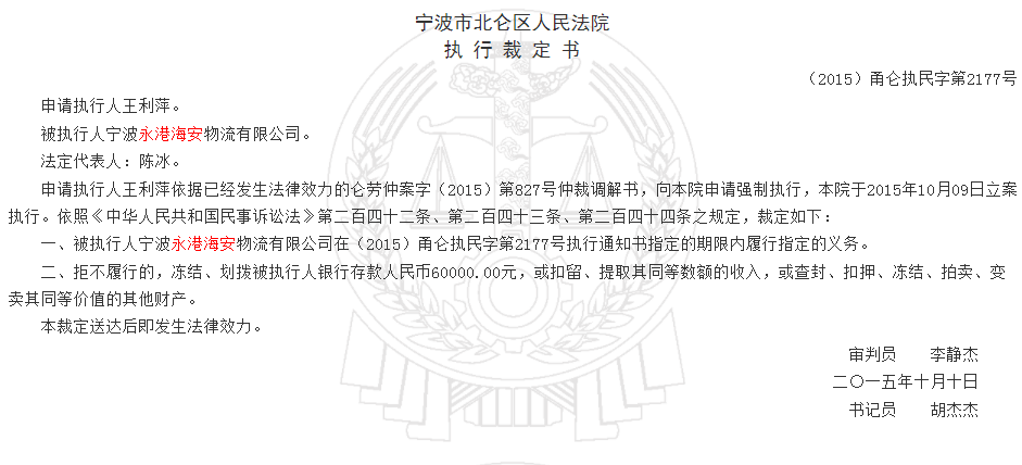 2019年9月10日,宁波市北仑区交通运输局出具《行政处罚决定书》(浙港政罚—BH[2019]5),由于永港海安未执行其内部的危险作业管理制度,违反了《浙江省安全生产条例》第十八条的规定,宁波市北仑区交通运输局依据浙江省安全生产条例,决定责令永港海安改正并处以罚款人民币2万元的行政处罚。