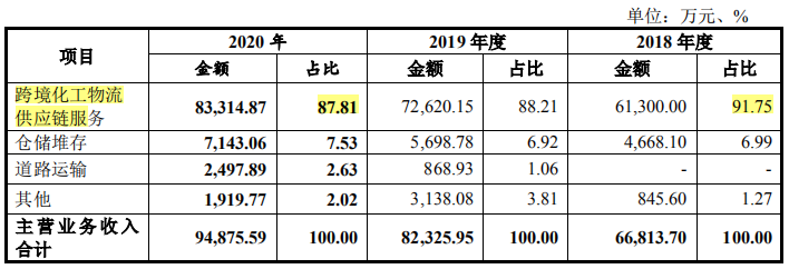 永泰运主业为化工物流供应链服务,公司服务的下游产业为化工行业,主要客户为各类化工生产企业、国际贸易商等。2018年-2020年,永泰运的营业收入分别为6.68亿元、8.27亿元和9.52亿元,净利润分别为5093.26万元、6246.13万元和7365.95万元,跨境化工物流供应链服务系公司主要的收入来源,2018年-2020年实现收入占主营业务收入的比例分别为91.75%、88.21%和87.81%。