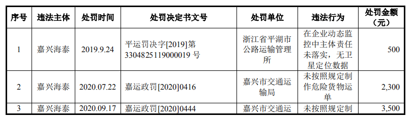 据平运罚决字[2019]第3304825119000019号文件显示,2019年嘉兴海泰因在企业动态监控中主体责任未落实,无卫星定位数据,浙江省平湖市公路运输管理所对其处以500元罚款;2020年两次因未按照规定制作危险货物运单,受到嘉兴市交通运输局的处罚,罚款合计5,800元。2019年凯密克曾多次因超限行驶受到处罚,累计罚款达9,350元。