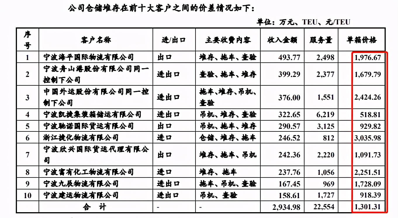 报告期内,永泰运仓储堆存的单箱收入差异系不同客户的货物状态、清关查验 情况不同导致操作内容不同所致。总体来说,公司仓储堆存的单箱收入大部分处于1,000 元/TEU至2,000元/TEU之间,部分客户单位平均价格高于上述区间主要是因海关查验、船期延误或进口货物长期未提货等原因导致集装箱堆存时间较长,产生了较高的堆存费。