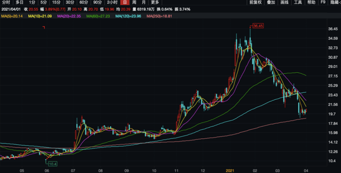 二级市场方面,自2021年1月26日股价涨至阶段性高点36.45港元/股后,该公司股价进入下行趋势。截至4月1日收盘,吉利汽车股价收于20.55港元/股,降幅接近44%。