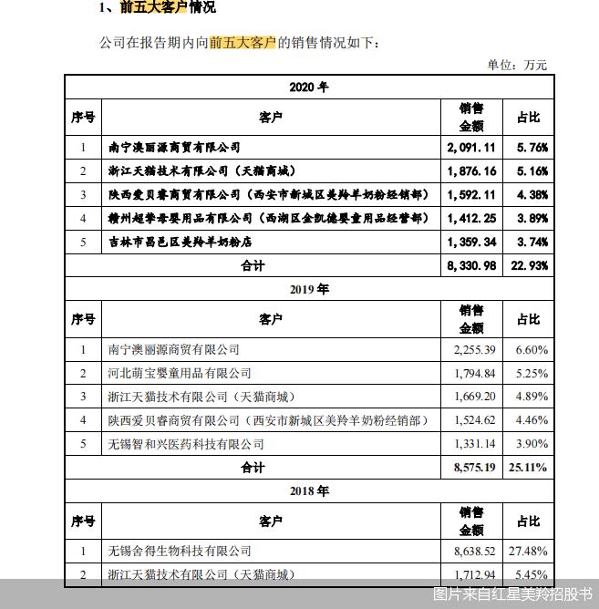 舍得生物退出后,南宁澳丽源商贸有限公司(以下简称“澳丽源商贸”)在2019、2020年成为了红星美羚第一大客户。但从销售数据来看,红星美羚对澳丽源商贸的销售金额远不及舍得生物。