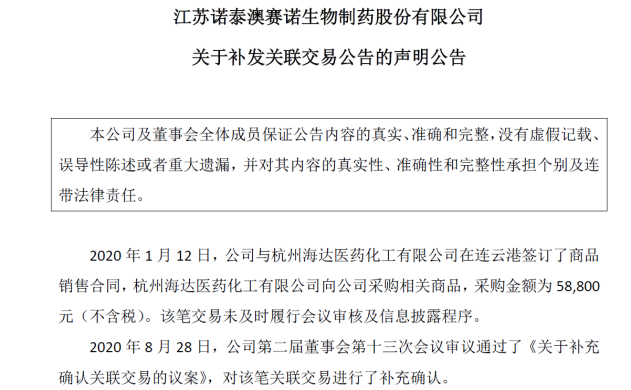 此外,2020年1月12日,诺泰生物与杭州海达医药化工有限公司在连云港签订了商品销售合同,杭州海达医药化工有限公司向公司采购相关商品,采购金额为58800元(不含税)。 该笔交易未及时履行会议审核及信息披露程序。