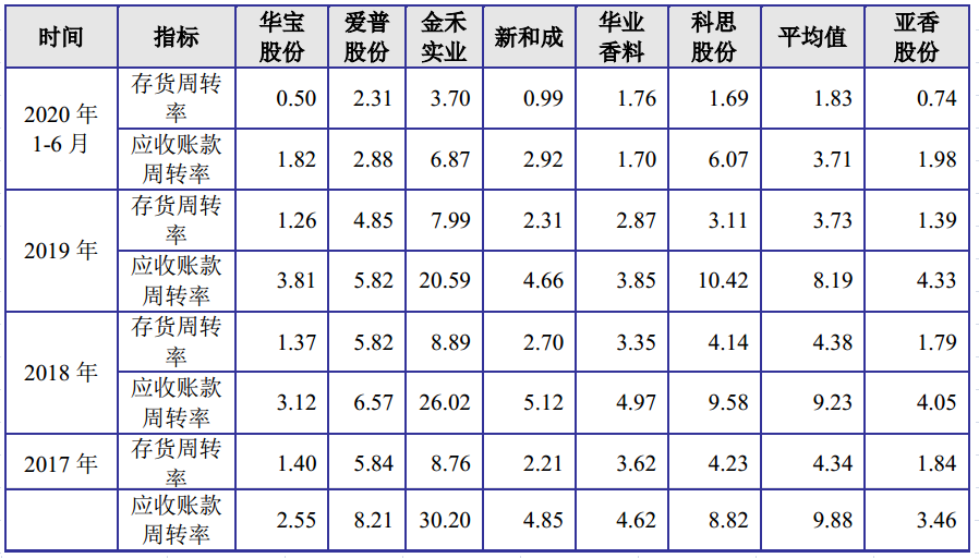 同时,招股书披露的报告期内应收账款周转率分别为3.46、4.05、4.33和1.98,该公司以华宝股份、爱普香料、金禾转债、新和成、华业香料、科思股份六家上市公司作为对标,而同行业应收账款周转率平均值分别为9.88、9.23、8.19和3.71,亚香股份的应收账款周转率远低于同行业上市公司平均水平。