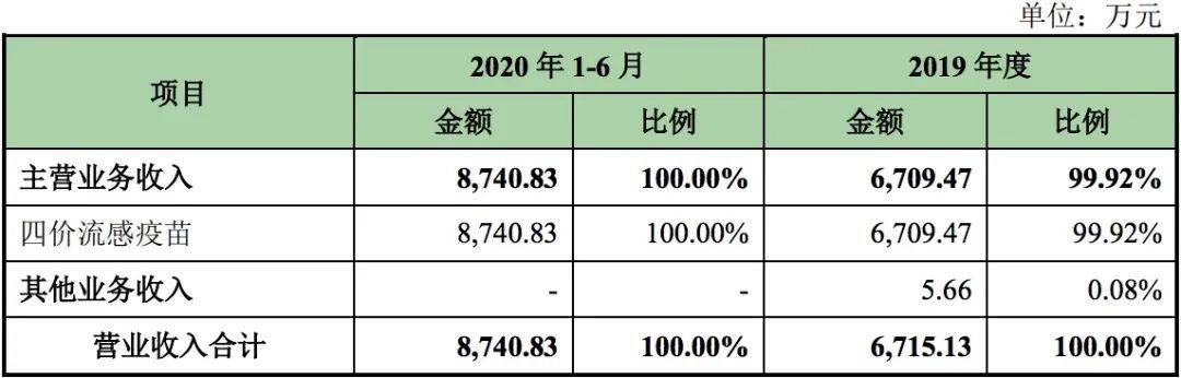根据招股书数据披露,该公司主营业务收入占营业收入的比重在99%以上,主营业务突出,而2019年和2020年上半年,该公司的主营业务收入分别为 0.67亿元和0.87亿元,均为四价流感疫苗所贡献营收,且呈现出增长趋势。