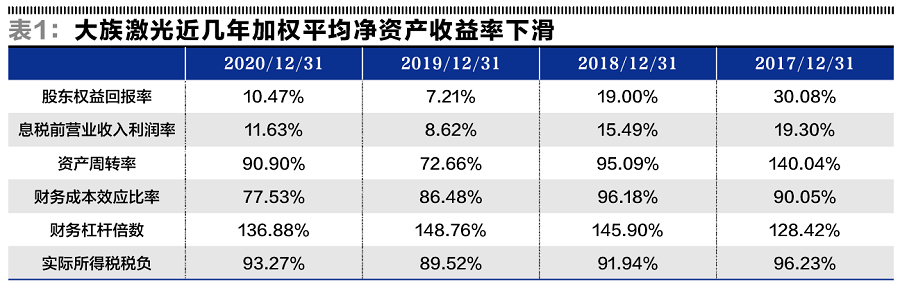 然而,与券商研报和公司年报形成对比的,则是大族激光最近几年的加权平均净资产收益率的下滑(见表1)。