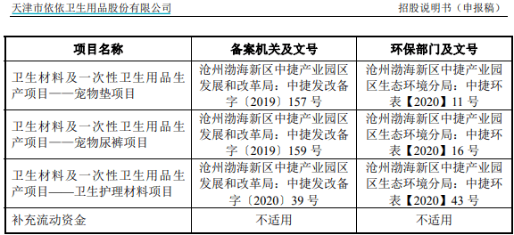 但是,后一版招股书新增的募投项目“卫生护理材料项目”的备案文号,还是早于前后两版招股书均涉及到的募投项目“宠物垫项目”和“宠物尿裤项目”,在此背景下,“卫生护理材料项目”却没有被列入到前一次招股书的募投项目中,对此依依股份并未接受记者采访。