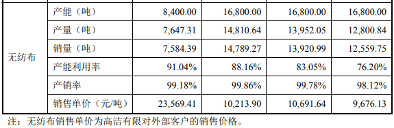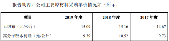 再来看依依股份的主业相关信息,该公司的主要产品包括无纺布,招股书披露,公司在2017年到2019年对外销售无纺布的单价约为1万元/吨,也即10元/公斤左右;招股书还披露依依股份的同行业可比公司包括2020年9月刚上市的豪悦护理,根据豪悦护理发布的招股书显示,该公司的主要原材料包括无纺布,但是采购价格则稳定在15元/公斤左右,比依依股份销售无纺布的单价高出了约50%。