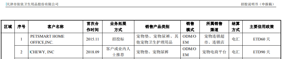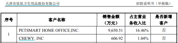 不仅如此,根据招股书披露的“北美地区”主要客户信息,依依股份将“PETSMART HOME FFICE,INC.”与“CHEWY,INC.”作为同一实际控制下的客户,合并计算销售位列依依股份的第一大客户;但与此同时,招股书第173页披露的“前五大客户的基本信息”中显示,“PETSMART HOME FFICE,INC.”的业务拓展方式为招投标,而“CHEWY,INC.”的拓展方式为“客户或业内人士推荐”,针对同一实际控制的两家不同主体,不论是销售产品类别还是信用政策均完全一致,拓展方式却存在本质不同,这也不符合正常的商业逻辑。
