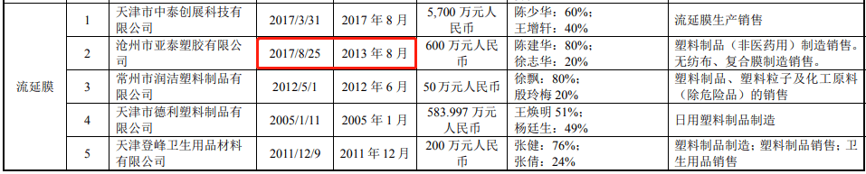 更何况,根据招股书披露的“各类原材料的前五大供应商”信息,依依股份的主要原材料“流延膜”的供应商之一为“常州市亚泰塑胶有限公司”,该供应商成立时间是2017年8月,但是招股书显示双方首次合作是在2013年8月,这并不符合正常的商业逻辑。