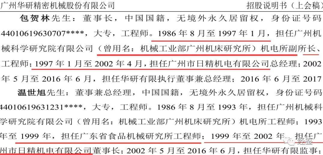 值得注意的是,招股说明书披露,包贺林于1986年8月至1997年1月,担任广州机械科学研究院有限公司(曾用名:机械工业部广州机床研究所)机电所副所长、工程师;温世旭于1993年至1999年,担任广东省食品机械研究所工程师。也就是说,包贺林、温世旭合资成立广州日精机电前后,二人均在公职单位任职,不知是否实质上形成兼职、对外投资行为?是否违反当时国有制单位任职规定?