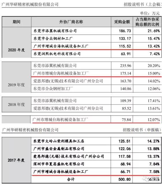 另据招股说明书披露,广州市增城台海机械设备加工厂(以下简称“台海机械”)是华研精机前5大外协加工商,2017年-2020年,双方合作金额分别为66.71万元、115.2万元、175.14万元和75.84万元。