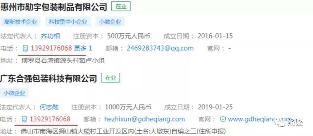 “巧合”的是,工商资料显示,惠州勋宇所登记的联系电话同时还登记在广东合强包装科技有限公司(以下简称“合强包装”)的工商资料中,该司于2019年注册成立,经营范围与华研精机业务高度相似。不知华研精机与合强包装是否存在业务往来?是否存在关联关系?