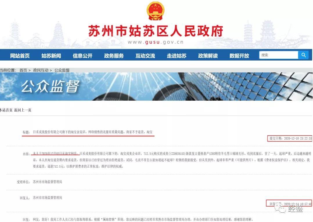 戎美股份的产品质量问题不止如此。据苏州市姑苏区人民政府官网公众监督板块显示,有消费者向当地执法部门投诉,戎美股份售出产品存在质量问题且不接收退货,当地执法部门已将该投诉转交常熟市场监督管理局处理。