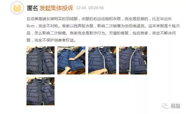 此外,在黑猫投诉网也有消费者发起一个集体投诉,投诉对象为天猫,投诉问题为假货,要求退款,消费者称:购买戎美高端女装的羽绒服是劣质产品,一边完全是扭曲的。不知公司产品是否存在质量问题?后续将如何处理?