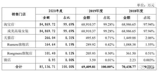 报告期内,戎美股份销售收入主要通过淘宝、天猫等第三方平台实现,目前主要运营一家淘宝门店及两家天猫门店,其中来自淘宝店铺“戎美高端女装”的销售收入分别为6.90亿元、6.89亿元、8.49亿元,占营业收入的比例分别为97.94%、99.28%、99.69%。