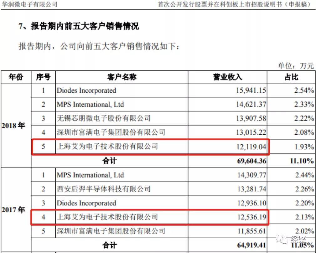 无锡华润上华是科创板上市公司华润微电子有限公司(以下简称“华润微”)的全资子公司,在华润微招股说明书披露,2017年,华润微向艾为电子的销售额为12,536.19万元,与艾为电子披露的交易金额相差近600万元。